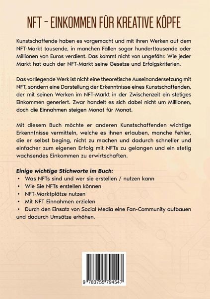 Kunstschaffende haben es vorgemacht und mit ihren Werken auf dem NFT-Markt tausende, in manchen Fällen sogar hunderttausende oder Millionen von Euros verdient. Das kommt nicht von ungefähr. Wie jeder Markt hat auch der NFT-Markt seine Gesetze und Erfolgskriterien.Das vorliegende Werk ist nicht eine theoretische Auseinandersetzung mit NFT, sondern eine Darstellung der Erkenntnisse eines Kunstschaffenden, der mit seinen Werken im NFT-Markt in der Zwischenzeit ein stetiges Einkommen generiert. Zwar handelt es sich dabei nicht um Millionen, doch die Einnahmen steigen Monat für Monat.Mit diesem Buch möchte er anderen Kunstschaffenden wichtige Erkenntnisse vermitteln, welche es ihnen erlauben, manche Fehler, die er selbst beging, nicht zu machen und dadurch schneller und einfacher zum eigenen Erfolg mit NFTs zu gelangen und ein stetig wachsendes Einkommen zu erwirtschaften.Einige wichtige Stichworte im Buch: _ Was NFTs sind und wer sie erstellen / nutzen kann_ Wie Sie NFTs erstellen können_ NFT-Marktplätze nutzen_ Mit NFT Einnahmen erzielen_ Durch den Einsatz von Social Media eine Fan-Community aufbauen und dadurch Umsätze erhöhen.