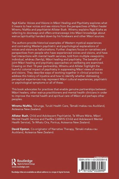 The authors provide historical examples of Western mystical experiences and contrasting Western psychiatric and psychological explanations of voices and visions as hallucinations. Further chapters focus on narratives and perspectives from people who have experienced voices and visions, and have had interactions with mental health services, told from multiple viewpoints; individual, whanau (family), Maori healing and psychiatry. The benefits of joint Maori healing and psychiatry approaches on wellbeing are examined. Drawing on their 18-year partnership, Wiremu and Allister highlight the harmful colonial impact of psychiatry in suppressing Maori views of voices and visions. They describe ways of working together in clinical practice to address this history of injustice and how to identify whether distressing perceptual experiences may represent Maori cultural experiences, psychiatric or psychological symptoms or all of these.