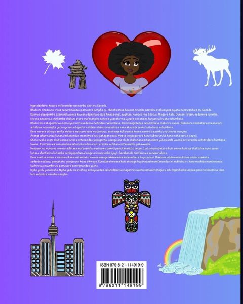 Ngatidzidzirei kutara mifananidzo yenzvimbo dziri mu Canada. Bhuku iri rinotaura trivia nezvirokwazvo pamusoro penyika iyi. Munokwanisa kuwana nzvimbo nezvinhu zvakasiyana siyana zvinowanikwa mu Canada. Dzimwe dzenzvimbo dzamunokwanisa kuwana dzinoitwa idzo Amaze-ing Laughter, Famous Five Statue, Niagara Falls, Duncan Totem, nedzimwe nzvimbo. Mwana anopihwa chinhambo chekuti atare mufananidzo nenzira yaanofarira uyezve inoratidza hunyanzvi hwake nehumbesa. Bhuku rino rakagadzirwa nemunyati unotevedzera zvidzidzo zvehumbesa. Rinochengetedza nekukoshesa makuriro evana. Nokudaro rinobatsira mwana kuti adzidzire nezvenyika yedu uyezve achigadzira dzikiso dzinozomubatsira kana akazoda zvake kuita basa rehumbesa. Kana mwana achinge asvika makore mashanu kana matanhatu, anotanga kukwanisa kuona mamiriro ezvinhu zvatinoona munyika. Anenge akukwanisa kutara mifananidzo inoonekwa kuti yakagara pasi, kwete inoyangarara kana kubhururuka kana makaitarisa papeji. Chero zvake asati akukwanisa kutara mifananidzo yakagozha, anenge ane chido chekutara mifananidzo yakawanda wanda kuti arambe achidzidzira humbesa. hwake. Tinofanirwa kumusimbisa nekumukurudzira kuti arambe achitara mifananidzo yakawanda. Nenguva ino munoona mwana achitara mufananidzo ozviisawo pakati pemufananidzo iwoyo. Izvi zvinomubatsira kuti awone kuti iye akakosha mune zvaari kutara. Anofarira kutamba achinyepedzera kunge ari munzvimbo iyoyo. Sevabereki tinofanirwa kuzvikurudzira. Kana asvitsa makore mashanu kana matanhatu, mwana anenge akukwanisa kutevedzera huyerapasi. Munoona achikwanisa kuona zvinhu zvakaita sedenderedzwa, gonyatatu, gonyarura, kana sikweya. Kurudzirai mwana kuti atsvage huyerapasi mumifananidzo iri mubhuku iri. Kana muchida munokwanisa kudhirowa muumbirwo pamusoro pemifananidzo yacho. Nyika yedu yakakosha. Nyika yedu ine zvizhinji zvinoyevedza nekutidzidzisa magariro evanhu nemadzitateguru edu. Ngatikoshesei pasi pano tichibatsira vana kuti vadzidze manakiro enyika.