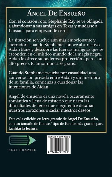 Con el corazón roto, Stephanie Ray se ve obligada a abandonar a sus amigas en Texas y mudarse a Luisiana para empezar de cero. La situación se vuelve aún más emocionante y aterradora cuando Stephanie conoce al atractivo Aidan Bane y descubre las fuerzas malignas que se esconden en el místico mundo de la magia negra. Aidan le ofrece su poderosa protección... pero a un alto precio. El amor nunca es gratis. Cuando Stephanie escucha por casualidad una conversación privada entre Aidan y un miembro de su familia, comienza a cuestionar las intenciones de Aidan. Ángel de ensueño es una novela oscuramente romántica y llena de misterio que narra las dificultades de tener que elegir entre desafiar nuestros corazones o saciar nuestros deseos. Esta es la edición en letra grande de Ángel De Ensueño, con un tipo de letra más grande para facilitar la lectura.