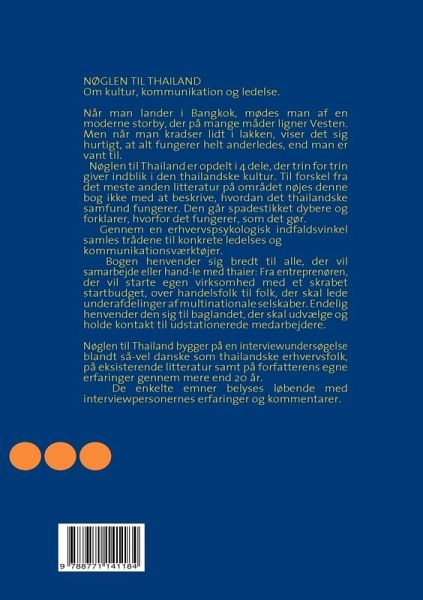 NØGLEN TIL THAILAND Om kultur, kommunikation og ledelse. Når man lander i Bangkok, mødes man af en moderne storby, der på mange måder ligner Vesten. Men når man kradser lidt i lakken, viser det sig hurtigt, at alt fungerer helt anderledes, end man er vant til. Nøglen til Thailand er opdelt i 4 dele, der trin for trin giver indblik i den thailandske kultur. Til forskel fra det meste anden litteratur på området nøjes denne bog ikke med at beskrive, hvordan det thailandske samfund fungerer. Den går spadestikket dybere og forklarer, hvorfor det fungerer, som det gør. Gennem en erhvervspsykologisk indfaldsvinkel samles trådene til konkrete ledelses og kommunikationsværktøjer. Bogen henvender sig bredt til alle, der vil samarbejde eller hand-le med thaier: Fra entreprenøren, der vil starte egen virksomhed med et skrabet startbudget, over handelsfolk til folk, der skal lede underafdelinger af multinationale selskaber. Endelig henvender den sig til baglandet, der skal udvælge og holde kontakt til udstationerede medarbejdere. Nøglen til Thailand bygger på en interviewundersøgelse blandt så-vel danske som thailandske erhvervsfolk, på eksisterende litteratur samt på forfatterens egne erfaringer gennem mere end 20 år. De enkelte emner belyses løbende med interviewpersonernes erfaringer og kommentarer.