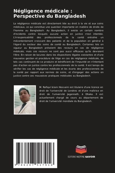 La négligence médicale est directement liée au droit à la vie et aux soins médicaux, ce qui constitue une question importante en matière de droits de l'homme au Bangladesh. Au Bangladesh, il existe un certain nombre d'incidents contre lesquels aucune action en justice n'est intentée. L'irresponsabilité des professionnels de la santé entraîne un mécontentement croissant des patients et de la population en général à l'égard du secteur des soins de santé au Bangladesh. Certaines lois en vigueur au Bangladesh prévoient des recours en cas de négligence médicale, mais ces recours ne sont pas aussi efficaces qu'ils devraient l'être. En raison de lacunes dans les dispositions légales existantes et d'une mauvaise gestion et procédure de litige en cas de négligence médicale, de tels cas continuent de se produire et bénéficient de l'impunité en n'intentant pas d'action en justice contre les professionnels de la santé. Il est temps de vérifier les cas de négligence médicale et les écarts des professionnels de la santé par rapport aux normes de soins, et d'engager des actions en justice contre ces mauvaises pratiques médicales au Bangladesh.