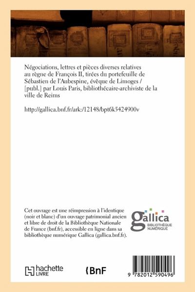 Negociations, lettres et pieces diverses relatives au regne de Francois II, tirees du portefeuille de Sebastien de l'Aubespine, eveque de Limoges / [publ.] par Louis Paris, bibliothecaire-archiviste de la ville de ReimsDate de l'edition originale: 1841Sujet de l'ouvrage: L'Aubespine, Sebastien de (1518-1582) -- CorrespondanceFrance -- 1559-1560 (Francois II) -- SourcesCollection: Collection de documents inedits sur l'histoire de FranceCe livre est la reproduction fidele d'une oeuvre publiee avant 1920 et fait partie d'une collection de livres reimprimes a la demande editee par Hachette Livre, dans le cadre d'un partenariat avec la Bibliotheque nationale de France, offrant l'opportunite d'acceder a des ouvrages anciens et souvent rares issus des fonds patrimoniaux de la BnF.Les oeuvres faisant partie de cette collection ont ete numerisees par la BnF et sont presentes sur Gallica, sa bibliotheque numerique.En entreprenant de redonner vie a ces ouvrages au travers d'une collection de livres reimprimes a la demande, nous leur donnons la possibilite de rencontrer un public elargi et participons a la transmission de connaissances et de savoirs parfois difficilement accessibles.Nous avons cherche a concilier la reproduction fidele d'un livre ancien a partir de sa version numerisee avec le souci d'un confort de lecture optimal. Nous esperons que les ouvrages de cette nouvelle collection vous apporteront entiere satisfaction.Pour plus d'informations, rendez-vous sur www.hachettebnf.frhttp: //gallica.bnf.fr/ark: /12148/bpt6k5424900v