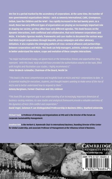 We live in a period marked by the ascendency of corporations. At the same time, the number of non-governmental organizations (NGOs) - such as Amnesty International, CARE, Greenpeace, Oxfam, Save the Children, and the WWF - has rapidly increased in the last twenty years. As a result, these two very different types of organization are playing an increasingly important role in shaping our society, yet they often have very different agendas. This book focuses on the dynamic interactions, both conflictual and collaborative, that exist between corporations and NGOs. It includes rigorous models, frameworks, and case studies to document the various ways that NGOs target corporations through boycotts, proxy campaigns, and other advocacy initiatives. It also explains the emerging pattern of cross-sectoral alliances and partnerships between corporations and NGOs. This book can help managers, activists, scholars, and students to better understand the nature, scope, and evolution of these complex interactions.