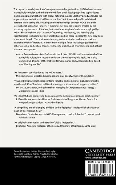 The organizational dynamics of non-governmental organizations (NGOs) have become increasingly complex as they have evolved from small local groups into sophisticated multinational organizations with global networks. Alnoor Ebrahim's study analyses the organizational evolution of NGOs as a result of their increased profile as bilateral partners in delivering aid. Focusing on the relationships between NGOs and their international network of funders, it examines not only the tensions created by the reporting requirement of funders, but also the strategies of resistance employed by NGOs. Ebrahim shows that systems of reporting, monitoring, and learning play essential roles in shaping not only what NGOs do but, more importantly, how they think about what they do. The book combines original case studies and research with an extensive review of literature. It draws from multiple fields including organizational behaviour, social and critical theory, civil society studies, and environmental and natural resource management.