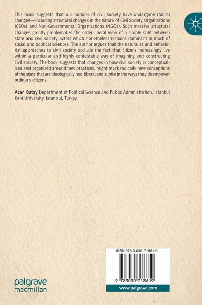 This book suggests that our notions of civil society have undergone radical changes-including structural changes in the nature of Civil Society Organizations (CSOs) and Non-Governmental Organizations (NGOs). Such massive structural changes greatly problematize the older liberal view of a simple split between state and civil society actors which nonetheless remains dominant in much of social and political sciences. The author argues that the naturalist and behaviorist approaches to civil society occlude the fact that citizens increasingly live within a particular and highly contestable way of imagining and constructing civil society. The book shows that changes in how civil society is conceptualized and organized around new practices, might mark radically new conceptions of the state that are ideologically neo-liberal and subtle in the ways they disempower ordinary citizens.
