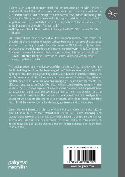 Part 1: The Market Revolution.- Chapter 1: Conservative Ascendancy : The 'Internal Market'.- Chapter 2: New Labour's 'Initiative-Itis': A Missed Target.- Chapter 3: The Coalition Government's Blunder: The Lansley Reform.- Chapter 4: The Cost Of The Market.- Part 2: A Corrective Counter-Revolution.- Chapter 5: Counter-Intuitive Tories: The Health And Care Bill.- Chapter 6: Left Behind: Opposition To The New Approach.- Part 3: Covid Crisis.- Chapter 7: Catastrophic Policy: A Reckless Regime.- Chapter 8: Living With Covid?.- Chapter 9: The Reckoning.- Part 4: How Much Pressure Can The Nhs Take?.- Chapter 10: Toxic Cocktail: A Hangover From Austerity, The Pandemic, Brexit And Social Care.- Chapter 11: Real Reform?.