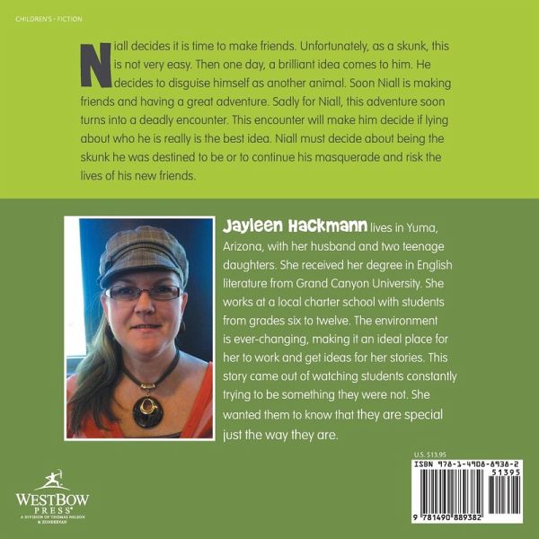 Niall decides it is time to make friends. Unfortunately, as a skunk, this is not very easy. Then one day, a brilliant idea comes to him. He decides to disguise himself as another animal. Soon Niall is making friends and having a great adventure. Sadly for Niall, this adventure soon turns into a deadly encounter. This encounter will make him decide if lying about who he is really is the best idea. Niall must decide about being the skunk he was destined to be or to continue his masquerade and risk the lives of his new friends.