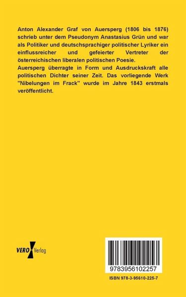 Auersperg überragte in Form und Ausdruckskraft alle politischen Dichter seiner Zeit. Das vorliegende Werk "Nibelungen im Frack" wurde im Jahre 1843 erstmals veröffentlicht.