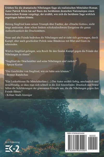 Erleben Sie die dramatische Nibelungen-Sage als realistischen Mittelalter-Roman. Autor Patrick Klein hat auf Basis des berühmten deutschen Nationalepos einen historischen Roman vorgelegt, der erzählt, wie sich die berühmte Sage wirklich zugetragen haben könnte. Herzog Siegfried kann seinen Triumph über Fanfnir, der 'Drache Gottes', nicht lange auskosten, denn schon fordern schicksalsschwere Ereignisse die ganze Aufmerksamkeit des Drachentöters. Neue und alte Feinde bedrohen die Nibelungen und er sieht sich gezwungen, durch Kampf, aber auch geschickter Politik neue Bündnisse mit Blut und Eisen zu schmieden. Wird es Siegfried gelingen, sein Reich für den finalen Kampf gegen die Feinde der Nibelungen zu rüsten? "Siegfried der Drachentöter und seine Nibelungen sind zurück!" - Speyer Kurier "Die Geschichte von Siegfried, wie sie hätte sein können." - Bonner Rundschau "Ein Leckerbissen für Mittelalterfans (...) Der Autor erzählt farbig, anschaulich und detailfreudig, so dass man sich schnell in die Zeit hineinfindet. Drastisch und brutal fallen die Schilderungen der grausamen Kämpfe aus, die die Nibelungen gegen ihre Feinde führen." - Kölner Stadt-Anzeiger Lassen Sie sich mit Band 2 der Trilogie "Nibelungenblut" in eine packende Neuinterpretation der berühmten Heldensage katapultieren, die ohne Fantasy-Elemente auskommt und die Handlung stattdessen in den realen Schlachten während der Christianisierung Germaniens ansiedelt.