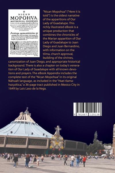 "Nican Mopohua" ("Here it is told") is the oldest narrative of the apparitions of Our Lady of Guadalupe. This richly illustrated eBook is a unique production that combines the chronicles of the Marian apparition of Our Lady of Guadalupe to Juan Diego and Juan Bernardino, with information on the tilma, church approval, building of the shrines, canonization of Juan Diego, and appropriate historical background. There is also a chapter on today's veneration of Our Lady of Guadalupe with all known devotions and prayers. The eBook Appendix includes the complete text of the "Nican Mopohua" in its original Náhualt language, as included in the "Huei tlamahuiçoltica," a 36-page tract published in Mexico City in 1649 by Luis Laso de la Vega.