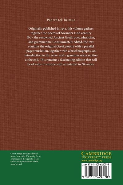 Originally published in 1953, this volume gathers together the poems of Nicander (2nd century BC), the renowned Ancient Greek poet, physician, and grammarian. Consummately edited, the text contains the original Greek poetry with a parallel page translation, together with a brief biography and an introduction to the verse.
