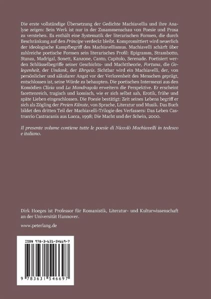 Die erste vollständige Übersetzung der Gedichte Machiavellis und ihre Analyse zeigen: Sein Werk ist nur in der Zusammenschau von Poesie und Prosa zu verstehen. Es enthält eine Systematik der literarischen Formen, die durch Beschränkung auf den Principe verdeckt bleibt. Kompromittiert wird neuerlich der ideologische Kampfbegriff des Machiavellismus. Machiavelli schärft über zahlreiche poetische Formen sein literarisches Profil: Epigramm, Strambotto, Stanza, Madrigal, Sonett, Kanzone, Canto, Capitolo, Serenade. Poetisiert werden Schlüsselbegriffe seiner Geschichts- und Machttheorie, Fortuna, die Gelegenheit, der Undank, der Ehrgeiz. Sichtbar wird ein Machiavelli, der, von persönlicher und säkularer Angst vor der Verlorenheit des Menschen geprägt, entschlossen ist, seine Würde zu behaupten. Die poetischen Intermezzi aus den Komödien Clizia und La Mandragola erweitern die Perspektive. Er erscheint facettenreich, tragisch und komisch, wie er sich selbst sah, Erotik, frühe und späte Lieben eingeschlossen. Die Poesie bestätigt: Zeit seines Lebens begriff er sich als Zögling der Freien Künste, von Sprache, Literatur und Musik. Das Buch bildet den dritten Teil der Machiavelli-Trilogie des Verfassers: Das Leben Castruccio Castracanis aus Lucca, 1998; Die Macht und der Schein, 2000.