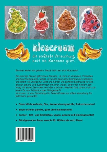 Nicecream, vegane Eiscreme aus Bananen, zucker-, fett-, und tierleidfrei.Bananen essen war gestern, heute mixt man sich Nicecream! Das cremige Eis aus gefrorenen Bananen, ist reich an Vitaminen, Mineralien und Spurenelementen, sättigt, ist schnell ganz ohne Eismaschine zubereitet, und liefert viel Energie für Geist und Körper. Die perfekte Ergänzung für alle, die sich gesund und ausgewogen ernähren wollen, oder ihren Kindern den Alltag mit etwas Gesundem versüßen möchten. Welches Kind träumt nicht von einem Eis zum Frühstück oder Mittagessen?!Nicecream ist vom Geheimtipp für Rohkostfreaks zur süßen Versuchung für jedermann geworden.Ohne Milchprodukte, Eier, Konservierungsstoffe, Industriezucker!Superschnell gemixt, ganz ohne Eismaschine!Zucker-, fett- und tierleidfrei, vegan, gesund mit Glücksgarantie!Sündigen ohne Reue, sowohl für Hüften als auch Tiere!
