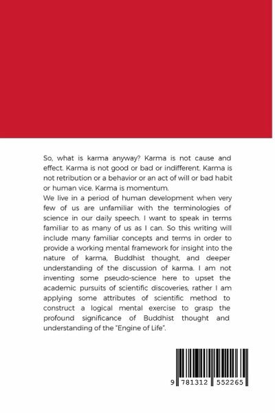 So, what is karma anyway? Karma is not cause and effect. Karma is not good or bad or indifferent. Karma is not retribution or a behavior or an act of will or bad habit or human vice. Karma is momentum. We live in a period of human development when very few of us are unfamiliar with the terminologies of science in our daily speech. I want to speak in terms familiar to as many of us as I can. So this writing will include many familiar concepts and terms in order to provide a working mental framework for insight into the nature of karma, Buddhist thought, and deeper understanding of the discussion of karma. I am not inventing some pseudo-science here to upset the academic pursuits of scientific discoveries, rather I am applying some attributes of scientific method to construct a logical mental exercise to grasp the profound significance of Buddhist thought and understanding of the "Engine of Life".