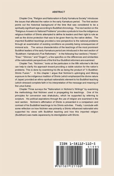 Chapter One, "Religion and Nationalism in Early Kamakura Society" introduces the issues that affected the nation in the early Kamakura period. The first section points out the historical background of the time that was considered to be a spiritually significant age according to Buddhist chronology. The next section on the "Religious Answers to National Problems" provides a prelude to how the indigenous religious tradition of Shinto attempted to define its leaders and their right to rule as well as the divine protection that was to be given them by the native deities. The imported Buddhist teachings provided a new perspective to the national problems through an examination of existing conditions as possibly being consequences of immoral acts. The various characteristics of the teachings of the most prominent Buddhist leaders of the early Kamakura period are introduced in the next section of "Buddhism: Kamakura's Five Reformers." In the following four sections ("Honen," "Eisai," "Shinran," and "Dogen"), a few specifics on the differences and similarities of the nationalistic perspectives of the first four Buddhist reformers are examined. Chapter Two, "Nichiren," looks at the particulars in the fifth reformer's life that can help to clarify his approach toward providing a viable solution for the nation's problems. This is done by examining his life as being the product of "A Buddhist-Shinto Fusion." In this chapter I argue that Nichiren's upbringing and lifelong exposure to the indigenous tradition of Shinto (which emphasized the divine nature of Japan) provided an ethno-spiritual nationalistic element to his Buddhist teaching (which stressed complete faith in his interpretation of the message and meaning of the Lotus Sutra). Chapter Three surveys the "Nationalism in Nichiren's Writings" by examining the methodology that Nichiren used in propagating his teachings. One of his principles for conversion was shakubuku, which he supported by referring to scripture. His political aspirations through the use of religion are examined in the next section. Nichiren's affirmation of Shinto is presented in a comparison and contrast of his Budddhist teachings to his Shinto activities. Finally, I conclude with some reflection on how Nichiren was primarily a Shinto influenced nationalist who supported his views with Buddhist teaching and how this imported religion (Buddhism) was made Japanese by its interdigitation with Shinto.