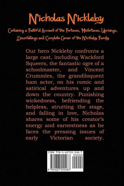 NICHOLAS NICKLEBY by Charles Dickens Containing a Faithful Account of the Fortunes, Misfortunes, Uprisings, Downfallings and Complete Career of the Nickleby Family Our hero Nickleby confronts a large cast, including Wackford Squeers, the fantastic ogre of a schoolmaster, and Vincent Crummles, the grandiloquent ham actor, on his comic and satirical adventures up and down the country. Punishing wickedness, befriending the helpless, strutting the stage, and falling in love, Nicholas shares some of his creator's energy and earnestness as he faces the pressing issues of early Victorian society.