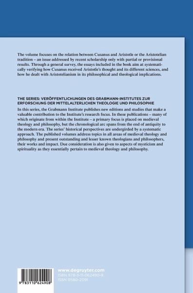 The volume focuses on the relation between Cusanus and Aristotle or the Aristotelian tradition. In recent years the attention on this topic has partially increased, but overall the scholarship results are still partial or provisional. The book thus aims at verifying more systematically how Aristotle and Aristotelianism have been received by Cusanus, in both their philosophical and theological implications, and how he approached the Aristotelian thought. In order to answer these questions, the papers are structured according to the traditional Aristotelian sciences and their reflection on Cusanus' thought. This allows to achieve some aspects of interest and originality: 1) the book provides a general, but systematic analysis of Aristotle's reception in Cusanus' thought, with some coherent results. 2) Also, it explores how a philosopher and theologian traditionally regarded as Neoplatonist approached Aristotle and his tradition (including Thomas Aquinas), what he accepted of it, what he rejected, and what he tried to overcome. 3) Finally, the volume verifies the attitude of a relevant Christian philosopher and theologian of the Humanistic age towards Aristotle.