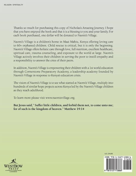 Thanks so much for purchasing this copy of Nicholas's Amazing Journey. I hope that you have enjoyed the book and that it is a blessing to you and your family. For each book purchased, one dollar will be donated to Naomi's Village. Naomi's Village is a children's home in Maai Mahiu, Kenya offering loving care to 60+ orphaned children. Child rescue is critical, but it is only the beginning. Naomi's Village offers holistic care through love, full nutrition, excellent healthcare, spiritual care, trauma counseling, and exposure to the world at large. Naomi's Village actively involves their children in serving the poor to instill empathy and a responsibility to answer the cries of their peers. In addition, Naomi's Village is empowering their children with a 1st world education through Cornerstone Preparatory Academy, a leadership academy founded by Naomi's Village in response to Kenya's education crisis. The vision of Naomi's Village is to see what started at Naomi's Village, multiply into hundreds of similar hope projects across Kenya led by the Naomi's Village children as they reach adulthood. To learn more please visit www.naomisvillage.org. But Jesus said," Suffer little children, and forbid them not, to come unto me; for of such is the kingdom of heaven." Matthew 19:14
