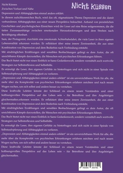 Buchbeschreibung: Nicht KüssenZwischen Verlust und NäheDepression und Abhängigkeiten einmal anders erklärt.In diesem aufschlussreichen Buch, wird das oft, stigmatisierte Thema Depression und die damit verbundenen Abhängigkeiten aus einer neuen Perspektive beleuchtet. Anhand von persönlichen Geschichten und psychologischen Einsichten wird der Leser auf eine Reise mitgenommen, die die tiefen Zusammenhänge zwischen emotionalen Herausforderungen und dem Streben nach Bewältigung offenbart. Sam, der Protagonist, durchlebt eine emotionale Achterbahnfahrt, die viele Leser in ihrer eigenen Lebensrealität erkennen werden. Er reflektiert über seine innere Zerrissenheit, die aus einer Kombination von Depression und dem Bedürfnis nach Verbindung entsteht. Mit eindringlichen Erzählungen und sensiblen Beobachtungen gelingt es dem Autor, die oft unsichtbaren Kämpfe darzustellen, die Menschen mit psychischen Erkrankungen führen. Das Buch bietet nicht nur einen Einblick in Sams Gedankenwelt, sondern vermittelt auch wertvolle Strategien zur Selbstreflexion und Selbsthilfe. Es ermutigt die Leser, ihre eigenen Gefühle zu hinterfragen und sich nicht in einer Spirale von Selbstaufopferung und Abhängigkeit zu verlieren. "Depression und Abhängigkeiten einmal anders erklärt" ist ein unverzichtbares Werk für alle, die mehr über die Komplexität von psychischen Erkrankungen erfahren möchten und nach neuen Wegen suchen, um sich selbst und andere besser zu verstehen. Diese kraftvolle Lektüre könnte der Schlüssel zu einem neuen Verständnis und einer hoffnungsvollen Perspektive auf das Leben sein - für Betroffene und ihre Angehörigen gleichermaßen.