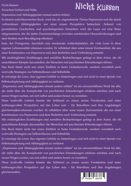 Buchbeschreibung: Nicht KüssenZwischen Verlust und NäheDepression und Abhängigkeiten einmal anders erklärt.In diesem aufschlussreichen Buch, wird das oft, stigmatisierte Thema Depression und die damit verbundenen Abhängigkeiten aus einer neuen Perspektive beleuchtet. Anhand von persönlichen Geschichten und psychologischen Einsichten wird der Leser auf eine Reise mitgenommen, die die tiefen Zusammenhänge zwischen emotionalen Herausforderungen und dem Streben nach Bewältigung offenbart. Sam, der Protagonist, durchlebt eine emotionale Achterbahnfahrt, die viele Leser in ihrer eigenen Lebensrealität erkennen werden. Er reflektiert über seine innere Zerrissenheit, die aus einer Kombination von Depression und dem Bedürfnis nach Verbindung entsteht. Mit eindringlichen Erzählungen und sensiblen Beobachtungen gelingt es dem Autor, die oft unsichtbaren Kämpfe darzustellen, die Menschen mit psychischen Erkrankungen führen. Das Buch bietet nicht nur einen Einblick in Sams Gedankenwelt, sondern vermittelt auch wertvolle Strategien zur Selbstreflexion und Selbsthilfe. Es ermutigt die Leser, ihre eigenen Gefühle zu hinterfragen und sich nicht in einer Spirale von Selbstaufopferung und Abhängigkeit zu verlieren. "Depression und Abhängigkeiten einmal anders erklärt" ist ein unverzichtbares Werk für alle, die mehr über die Komplexität von psychischen Erkrankungen erfahren möchten und nach neuen Wegen suchen, um sich selbst und andere besser zu verstehen. Diese kraftvolle Lektüre könnte der Schlüssel zu einem neuen Verständnis und einer hoffnungsvollen Perspektive auf das Leben sein - für Betroffene und ihre Angehörigen gleichermaßen.