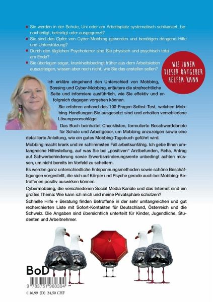 MOBBING macht nachweislich krank und im schlimmsten Fall arbeitsunfähig.Anhand des großen Mobbing-Tests im 100-FRAGEN-Katalog können Betroffene SOFORT feststellen, welchen Mobbinghandlungen sie ausgesetzt sind und bekommen verschiedene Lösungsansätze vorgeschlagen.Dieser Ratgeber wird empfohlen für Opfer und auch Angehörige von:Mobbing, Bossing und Cybermobbing.Er beinhaltet eine ausführliche Liste mit vielen Kontakten für die Soforthilfe für Kinder, Jugendliche, Studenten und Erwachsene. Es ist leider so, dass Mobbing, Bossing sowie Cyber-Mobbing viele Menschen im Laufe ihrer langen Schulzeit, während des Studiums oder, was am häufigsten vorkommt, im Arbeits- und Berufsleben trifft. Auch im neuen Ratgeber der "Nicht lange fackeln"-Reihe erklärt die Fachbuchautorin gewohnt direkt, unkonventionell und für jedermann leicht verständlich, wie Sie MOBBING, BOSSING und CYBER-MOBBING klar erkennen und effektiv sowie erfolgreich dagegen vorgehen können.Sie erhalten sehr ausführlich Anleitung, wie ein effektives Mobbing-Tagebuch geführt wird, das auch vor Gericht Bestand hat.In Abstimmung mit der Bayerischen Staatsregierung stellt Rena Rose mit freundlicher Genehmigung des Bayerischen Staatsministerium für Unterricht und Kultus unter anderem auch die "Initiative Medienführerschein Bayern" vor.Es werden bewährte Musterbriefe für Schule und Arbeitgeber bei Mobbing und Cyber-Mobbing zur Verfügung gestellt.Cyber-Mobbing und die verschiedenen Social-Media-Kanäle sind ein großes Thema im Buch - es wird u.a. ausführlich beschrieben, wie Nutzer sich und ihre Privatsphäre mit wenigen Einstellungen schützen können und wie Sie speziell gegen Cyber-Mobbing vorgehen müssen. Da eine länger andauernde Mobbingsituation die Betroffenen krank und dauerhaft arbeitsunfähig machen kann, gibt die Autorin daher auch umfangreich Hilfestellung und Auskunft, auf was bei "positiven" Arztbefunden, Reha, Antrag auf Schwerbehinderung sowie Erwerbsminderungsrente unbedingt geachtet werden muss, um nicht bereits im Vorfeld zu scheitern. Es werden ganz unterschiedliche Entspannungsmethoden vorgestellt, die sich auch gerade bei Mobbing bestens bewährt haben.Schnelle Hilfe und Beratung finden Betroffene in der umfangreichen und gut recherchierten Liste mit Sofort-Kontakten für Deutschland, Österreich und die Schweiz. Die Weiler Zeitung empfahl in ihrem großen Artikel vom 5.11.2020 diesen Ratgeber.Pressestimmen über die Autorin und ihre Bücher siehe unter Rena Rose.