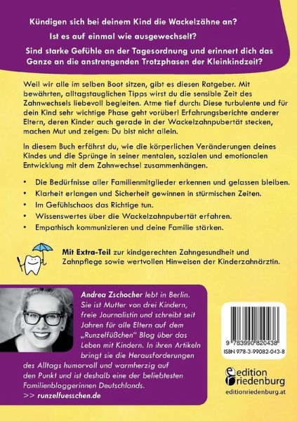 Kündigen sich bei deinem Kind die Wackelzähne an? Ist es auf einmal wie ausgewechselt? Sind starke Gefühle an der Tagesordnung und erinnert dich das Ganze an die anstrengenden Trotzphasen der Kleinkindzeit? Weil wir alle im selben Boot sitzen, gibt es diesen Ratgeber. Mit bewährten, alltagstauglichen Tipps wirst du die sensible Zeit des Zahnwechsels liebevoll begleiten. Atme tief durch: Diese turbulente und für dein Kind sehr wichtige Phase geht vorüber! Erfahrungsberichte anderer Eltern, deren Kinder auch gerade in der Wackelzahnpubertät stecken, machen Mut und zeigen: Du bist nicht allein.In diesem Buch erfährst du, wie die körperlichen Veränderungen deines Kindes und die Sprünge in seiner mentalen, sozialen und emotionalen Entwicklung mit dem Zahnwechsel zusammenhängen.+ Die Bedürfnisse aller Familienmitglieder erkennen und gelassen bleiben.+ Klarheit erlangen und Sicherheit gewinnen in stürmischen Zeiten.+ Im Gefühlschaos das Richtige tun.+ Wissenswertes über die Wackelzahnpubertät erfahren.+ Empathisch kommunizieren und deine Familie stärken.Mit Extra-Teil zur kindgerechten Zahngesundheit und Zahnpflege sowie wertvollen Hinweisen der Kinderzahnärztin.Verlag edition riedenburg Salzburg _ editionriedenburg.at _