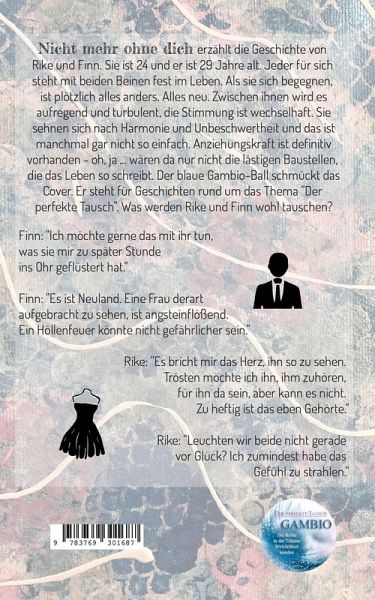 'Nicht mehr ohne dich' erzählt die Geschichte von Rike und Finn. Sie ist 24 und er ist 29 Jahre alt. Jeder für sich steht mit beiden Beinen fest im Leben. Als sie sich begegnen, ist plötzlich alles anders. Alles neu. Zwischen ihnen wird es aufregend und turbulent, die Stimmung ist wechselhaft. Sie sehnen sich nach Harmonie und Unbeschwertheit und das ist manchmal gar nicht so einfach. Anziehungskraft ist definitiv vorhanden, oh, ja ... wären da nur nicht die lästigen Baustellen, die das Leben so schreibt. Der blaue Gambio-Ball schmückt das Cover. Er steht für Geschichten rund um das Thema: 'Der perfekte Tausch' Was werden Rike und Finn wohl tauschen? Finn: "Ich möchte so gerne das mit ihr tun, was sie mir zu später Stunde ins Ohr geflüstert hat." Finn: "Es ist Neuland. Eine Frau derart aufgebracht zu sehen, ist angsteinflößend. Ein Höllenfeuer könnte nicht gefährlicher sein." Rike: "Es bricht mir das Herz, ihn so zu sehen. Trösten möchte ich ihn, ihm zuhören, für ihn da sein, aber kann es einfach nicht. Zu heftig ist eben Gehörte." Rike: "Leuchten wir beide nicht gerade vor Glück? Ich zumindest habe das Gefühl zu strahlen."