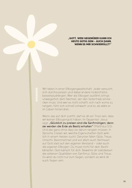 Jedes beginnt mit einer Doppelseite, auf der man nach dem Lesen des jeweiligen Bibelabschnitts seine Gedanken notieren kann. Dazu werden einige Leitfragen zur Orientierung angeboten. Darauf folgt das jeweils passende Gedicht von Sarah Marie, das dazu anregen möchte, den Blick auf den Bibeltext noch zu weiten. Zum Schluss gibt es einige Reflexionsfragen und eine kurze Andacht.