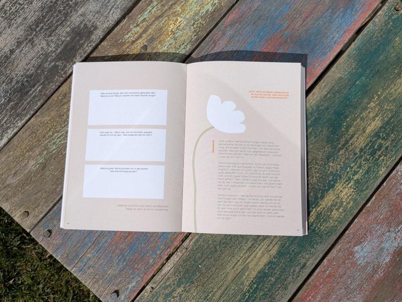 Der ganze Innenteil ist in sanften Farben und Formen gestaltet; Blumen stehen symbolisch für das Wachstum und die blühende Fülle, die sich beim Lesen und „Bearbeiten" einstellen und erfahren lassen können.