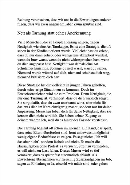 Du bist freundlich, hilfsbereit - und innerlich erschöpft. Denn der größte Selbstverrat geschieht nicht durch andere, sondern jedes Mal, wenn du Ja sagst, obwohl du Nein meinst. Vielleicht kennst du das: Du übernimmst Aufgaben, die du gar nicht willst. Du lächelst, obwohl du wütend bist. Du tröstest, obwohl du selbst keine Kraft mehr hast. Und während alle dich für deine Nettigkeit loben, wächst in dir ein leiser Schmerz - das Gefühl, dass dich niemand wirklich sieht. Doch die Wahrheit ist unbequem und befreiend zugleich: Nettsein ist keine Tugend, wenn es dich selbst zerstört. Was sich wie Rücksicht anfühlt, ist oft Selbstverleugnung. Was du für Harmonie hältst, ist manchmal nur Angst vor Ablehnung. Erst wenn du aufhörst, allen gefallen zu wollen, können dich Menschen wirklich erkennen - nicht als "die Nette", sondern als das, was du bist: echt, lebendig, unverstellt. Dieses Buch ist für alle, die genug davon haben, sich kleinzuhalten, um geliebt zu werden. Für alle, die ihre Stimme wiederfinden wollen, ohne Schuldgefühle, ohne Angst, ohne schlechtes Gewissen. Es zeigt dir, warum People Pleasing keine Freundlichkeit, sondern ein erlerntes Überlebensmuster ist und wie du es Schritt für Schritt hinter dir lässt. Mit klaren psychologischen Einsichten und alltagstauglichen Werkzeugen lernst du, Grenzen zu setzen, ohne dich schuldig zu fühlen, Schuldgefühle zu verstehen und loszulassen, und dein eigenes Leben wieder mutig in die Hand zu nehmen. Denn wer immer nett ist, wird vielleicht gemocht, aber selten respektiert. Wer echt ist, wird nicht von allen gemocht, aber endlich gesehen. Dies ist kein Buch über Härte. Es ist eine Einladung zur Freiheit. Zu einem Leben, das nicht angepasst, sondern authentisch ist. Nicht nett. Sondern echt.