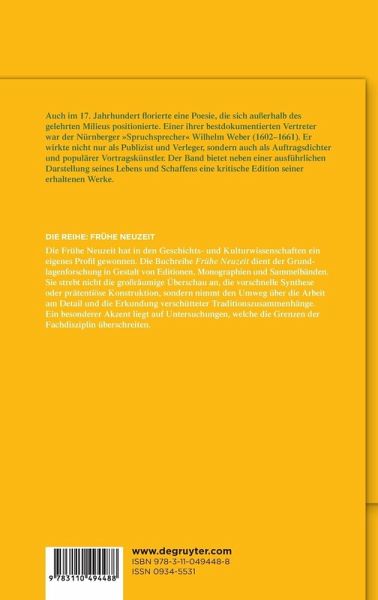 Von der Forschung kaum beachtet, hat sich im 17. Jahrhundert eine florierende literarische Praxis außerhalb des gelehrten Milieus positioniert. Poeten und Leser verweigerten sich den neuen ästhetischen Normen und orientierten sich weiterhin an althergebrachten Vorbildern. Einer der populärsten und bestdokumentierten Vertreter dieser nichtakademischen Poesie war der Nürnberger "Spruchsprecher" Wilhelm Weber (1602-1661). Er wirkte nicht nur als Autor und Verleger, sondern auch als Auftragsdichter und populärer Vortragskünstler.