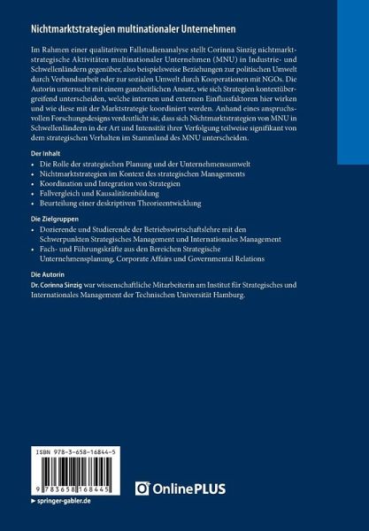 Im Rahmen einer qualitativen Fallstudienanalyse stellt Corinna Sinzig nichtmarktstrategische Aktivitäten multinationaler Unternehmen (MNU) in Industrie- und Schwellenländern gegenüber, also beispielsweise Beziehungen zur politischen Umwelt durch Verbandsarbeit oder zur sozialen Umwelt durch Kooperationen mit NGOs. Die Autorin untersucht mit einem ganzheitlichen Ansatz, wie sich Strategien kontextübergreifend unterscheiden, welche internen und externen Einflussfaktoren hier wirken und wie diese mit der Marktstrategie koordiniert werden. Anhand eines anspruchsvollen Forschungsdesigns verdeutlicht sie, dass sich Nichtmarktstrategien von MNU in Schwellenländern in der Art und Intensität ihrer Verfolgung teilweise signifikant von dem strategischen Verhalten imStammland des MNU unterscheiden.