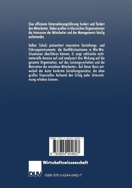 Eine effiziente Unternehmungsführung fordert und fördert den Mitarbeiter. Dabei prallen in klassischen Organisationen die Interessen der Mitarbeiter und des Managements häufig aufeinander. Volker Schulz präsentiert innovative Gestaltungs- und Führungsinstrumente, die Konfliktsituationen in Win-Win-Situationen überführen können. Er zeigt zahlreiche nichtmaterielle Anreize auf und analysiert ihre Wirkung auf die gesamte Organisation, auf das Leistungsverhalten und die Motivation des einzelnen Mitarbeiters. Auf dieser Basis entwickelt der Autor konkrete Gestaltungsansätze, die ohne großen finanziellen Aufwand den Erfolg jeder Unternehmung erhöhen können.