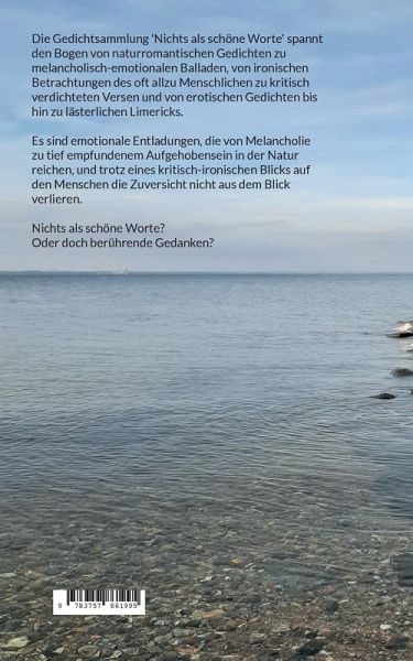 Die Gedichtsammlung 'Nichts als schöne Worte' spannt den Bogen von naturromantischen Gedichten zu melancholisch-emotionalen Balladen, von ironischen Betrachtungen des oft allzu Menschlichen zu kritisch verdichteten Versen und von erotischen Gedichten bis hin zu lästerlichen Limericks.Es sind emotionale Entladungen, die von Melancholie zu tief empfundenem Aufgehobensein in der Natur reichen und trotz eines kritisch-ironischen Blicks auf den Menschen die Zuversicht nicht aus dem Blick verlieren.Nichts als schöne Worte? Oder doch berührende Gedanken?