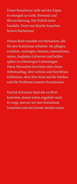 In diesem Buch begegnen Sie Menschen, die für den Sozialstaat arbeiten. Sie pflegen, erziehen, versorgen, beraten, unterstützen, retten, begleiten Geburten und später in schwierigen Lebenslagen. Diese Menschen berichten über ihren Arbeitsalltag, über schöne und furchtbare Erlebnisse. Sie zeigen auf, was besser werden muss. Patrick Schreiner lässt die zu Wort kommen, denen selten zugehört wird. Er zeigt, warum wir den Sozialstaat brauchen.