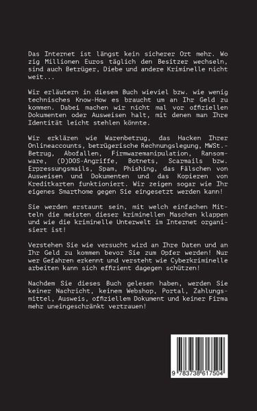 Das Internet ist längst kein sicherer Ort mehr. Wo zig Millionen Euros täglich den Besitzer wechseln, sind auch Betrüger, Diebe und andere Kriminelle nicht weit...Wir erläutern in diesem Buch wieviel bzw. wie wenig technisches Know-How es braucht um an Ihr Geld zu kommen. Dabei machen wir nicht mal vor offiziellen Dokumenten oder Ausweisen halt, mit denen man Ihre Identität leicht stehlen könnte. Wir erklären wie Warenbetrug, das Hacken Ihrer Onlineaccounts, betrügerische Rechnungslegung, MWSt.-Betrug, Abofallen, Firmwaremanipulation, Ransomware, (D)DOS-Angriffe, Botnets, Scarrmails bzw. Erpressungsmails, Spam, Phishing, das Fälschen von Ausweisen und Dokumenten und das Kopieren von Kreditkarten funktioniert. Wir zeigen sogar wie Ihr eigenes Smarthome gegen Sie eingesetzt werden kann!Sie werden erstaunt sein, mit welch einfachen Mitteln die meisten dieser kriminellen Maschen klappen und wie die kriminelle Unterwelt im Internet organisiert ist!Verstehen Sie wie versucht wird an Ihre Daten und an Ihr Geld zu kommen bevor Sie zum Opfer werden! Nur wer Gefahren erkennt und versteht wie Cyberkriminelle arbeiten kann sich effizient dagegen schützen!Nachdem Sie dieses Buch gelesen haben, werden Sie keiner Nachricht, keinem Webshop, Portal, Zahlungsmittel, Ausweis, offiziellem Dokument und keiner Firma mehr uneingeschränkt vertrauen!