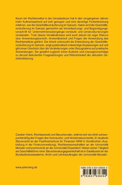 Kaum ein Rechtsinstitut in der Umsatzsteuer hat in den vergangenen Jahren mehr Aufmerksamkeit auf sich gezogen und eine derartige Fortentwicklung erfahren, wie die Geschäftsveräußerung im Ganzen. Dabei wird die Geschäftsveräußerung im Ganzen gemeinhin als Vereinfachungs- und Begünstigungsvorschrift für Unternehmensübergänge/-verkäufe und Umstrukturierungen verstanden. Trotz dieses Verständnisses wird auch aktuell ein reger Diskurs über Anwendungsbereich, Anwendbarkeit und Folgen der Anwendung des Rechtsinstituts geführt. Die Arbeit untersucht die Entwicklung der Geschäftsveräußerung im Ganzen, zeigt systematisch notwendige Anpassungen auf und gibt einen Überblick über die Veränderungen unter Bezugnahme auf praktische Anwendungen. Sie gewährt zugleich einen Ausblick und Lösungsvorschläge zu derzeit diskutierten Fragestellungen und Reformbedarf der aktuellen Gesetzesfassung.