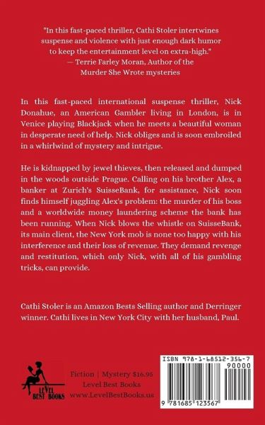 In this fast-paced international suspense thriller, Nick Donahue, an American Gambler living in London, is in Venice playing Blackjack when he meets a beautiful woman in desperate need of help. Nick obliges and is soon embroiled in a whirlwind of mystery and intrigue. He is kidnapped by jewel thieves, then released and dumped in the woods outside Prague. Calling on his brother Alex, a banker at Zurich's SuisseBank, for assistance, Nick soon finds himself juggling Alex's problem: the murder of his boss and a worldwide money laundering scheme the bank has been running. When Nick blows the whistle on SuisseBank, its main client, the New York mob is none too happy with his interference and their loss of revenue. They demand revenge and restitution, which only Nick, with all of his gambling tricks, can provide.