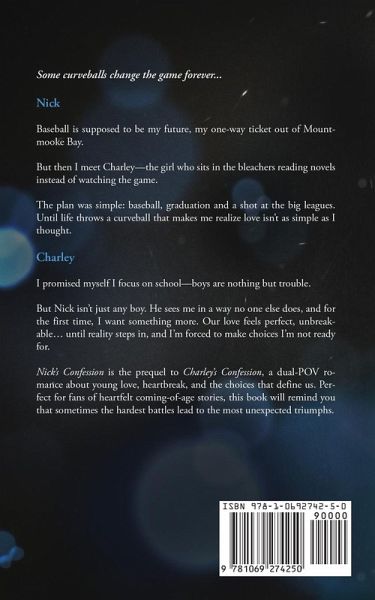 Some curveballs change the game forever. Nick Baseball is supposed to be my future, my one-way ticket out of Mountmooke Bay. But then I meet Charley-the girl who sits in the bleachers reading novels instead of watching the game. The plan was simple: baseball, graduation and a shot at the big leagues. Until life throws a curveball that makes me realize love isn't as simple as I thought. Charley I promised myself I focus on school-boys are nothing but trouble. But Nick isn't just any boy. He sees me in a way no one else does, and for the first time, I want something more. Our love feels perfect, unbreakable... until reality steps in, and I'm forced to make choices I'm not ready for. Nick's Confession is the prequel to Charley's Confession, a dual-POV romance about young love, heartbreak, and the choices that define us. Perfect for fans of heartfelt coming-of-age stories, this book will remind you that sometimes the hardest battles lead to the most unexpected triumphs.