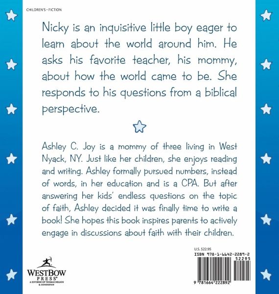 Nicky always wondered, what happened when it thundered? What makes the Sun come out to play? And where does the Moon go when it goes away? It was time for bed after Nicky's prayers were said. "Mommy?" Nicky asked, "did you make the Stars?" His mommy tried not to laugh as she held him in her arms. "Of course not, Nicky!" Mommy said. "God placed them in the Sky" Nicky asked, "But when did He do it, and why?" So, his Mommy told him the story about how God made the world for His glory.
