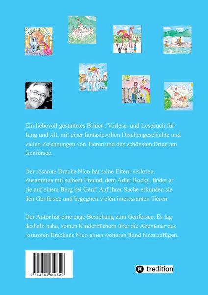 Ein liebevoll gestaltetes Bilder, Vorlese und Lesebuch für Jung und Alt, mit einer fantasievollen Drachengeschichte und vielen Zeichnungen von Tieren und den schönsten Orten am Genfersee. Der rosarote Drache Nico hat seine Eltern verloren. Zusammen mit seinem Freund, dem Adler Rocky, findet er sie auf einem Berg bei Genf. Auf ihrer Suche erkunden sie den Genfersee und begegnen vielen interessanten Tieren.Der Autor hat eine enge Beziehung zum Genfersee. Es lag deshalb nahe, seinen Kinderbüchern über die Abenteuer des rosaroten Drachens Nico einen weiteren Band hinzuzufügen.