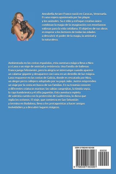 En esta aventura mágica ambientada en las costas españolas, los lectores acompañan a un grupo de animales en un viaje de amistad y resistencia. Una familia de ballenas francas, una especie en peligro de extinción, juega felizmente en el mar, pero la alegría se interrumpe cuando Lana, la más pequeña, es atacada por un calamar gigante y desaparece en un destello de luz mágica. Lana reaparece en las costas de Galicia, donde es rescatada por Nico, un alegre perro callejero recién adoptado por su papá Julio. Juntos emprenden un viaje por la costa española en busca de sus familias. En su travesía, se encuentran con una variedad de criaturas marinas, cada una con su propia historia: sabias cangrejitas, una tímida sepia, una raya hambrienta pero amigable, e incluso un juguetón zifio. Esta aventura está impregnada de misterio y coraje, y cuenta con la protección de Guillermina, una diosa sirena que vigila los océanos. Cuando Lana y Nico se enfrentan nuevamente al calamar gigante, Guillermina los protege con su inmensa luz e inagotable amor. El viaje, que comienza en San Sebastián y termina en Cadaqués, lleva a los protagonistas a hacer amigos inolvidables, descubrir lugares mágicos y lograr una reconfortante reunión familiar. La historia recuerda a los lectores la importancia de la bondad, la valentía y el respeto por la naturaleza. Un cuento colorido diseñado para que lo disfruten lectores de todas las edades en familia, para celebrar las emociones que nos hacen sentir humanos y profundizar nuestro amor por los demás. Nos inspira a cuidarnos a nosotros mismos y a nuestros seres queridos con mucho respeto y amor. Espero que disfrutes esta historia. No olvides escribir tus reviews!!