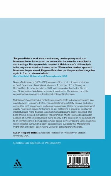 Nicolas Malebranche (1638-1715) was one of the most notorious and pious of Rene Descartes' philosophical followers. A member of The Oratory, a Roman Catholic order founded in 1611 to increase devotion to the Church and St. Augustine, Malebranche brought together his Cartesianism and his Augustinianism in a rigorous theological-philosophical system.Malebranche's occasionalist metaphysics asserts that God alone possesses true causal power. He asserts that human understanding is totally passive and relies on God for both sensory and intellectual perceptions. Critics have wondered what exactly his system leaves for humans to do. Yet leaving a space for true human intellectual and moral freedom is something Malebranche clearly intended. This book offers a detailed evaluation of Malebranche's efforts to provide a plausible account of human intellectual and moral agency in the context of his commitment to an infinitely perfect being possessing all causal power. Peppers-Bates suggests that Malebranche might offer a model of agent-willing useful for contemporary theorists.