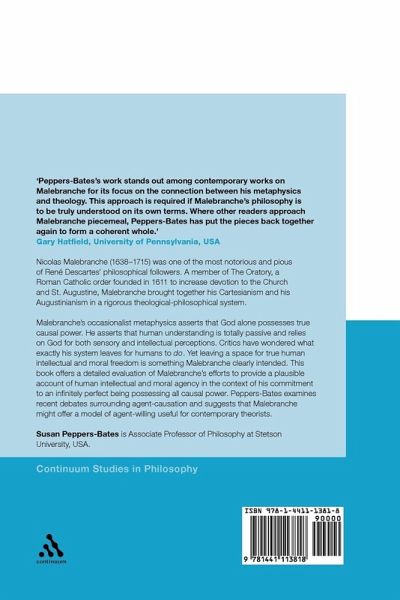 Nicolas Malebranche (1638-1715) was one of the most notorious and pious of Rene Descartes' philosophical followers. A member of The Oratory, a Roman Catholic order founded in 1611 to increase devotion to the Church and St. Augustine, Malebranche brought together his Cartesianism and his Augustinianism in a rigorous theological-philosophical system.Malebranche's occasionalist metaphysics asserts that God alone possesses true causal power. He asserts that human understanding is totally passive and relies on God for both sensory and intellectual perceptions. Critics have wondered what exactly his system leaves for humans to do. Yet leaving a space for true human intellectual and moral freedom is something Malebranche clearly intended. This book offers a detailed evaluation of Malebranche's efforts to provide a plausible account of human intellectual and moral agency in the context of his commitment to an infinitely perfect being possessing all causal power. Peppers-Bates suggests that Malebranche might offer a model of agent-willing useful for contemporary theorists.