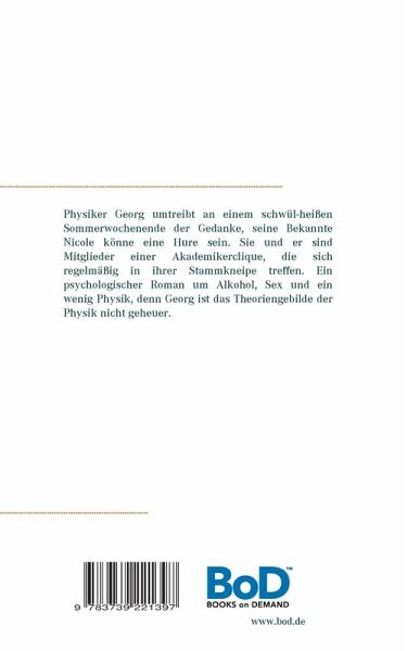 Physiker Georg umtreibt an einem schwül-heißen Sommerwochenende der Gedanke, seine Bekannte Nicole könne eine Hure sein. Sie und er sind Mitglieder einer Akademikerclique, die sich regelmäßig in ihrer Stammkneipe treffen. Ein psychologischer Roman um Alkohol, Sex und ein wenig Physik, denn Georg ist das Theoriengebilde der Physik nicht geheuer.