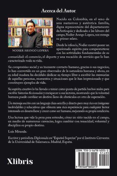 Nacido en Colombia, en el seno de una numerosa y auténtica familia, digna representante del departamento deAntioquia y dedicada a las labores del campo, Nodier Arango Lopera, nos entrega su primer relato. Desde la infancia, Nodier mostró poseer un apasionado espíritu para comprometerse con las actividades fundamentales de su comunidad: el comercio, el deporte y una vocación de servicio que lo han caracterizado toda su vida. Su compromiso social y su incesante contacto humano, gracias a sus negocios, lo han convertido en un gran observador de la naturaleza humana y ahora, en su edad madura ha decidido dedicar su tiempo libre a escribir las memorias de aquellas personas, momentos y situaciones que le han impresionado y que constituyen ejemplos de vida. Su espíritu creativo lo ha llevado a tomar como punto de partida hechos reales para escribir historias ficcionadas y enriquecer a sus lectores, mostrando que la voluntad humana puede cambiar un destino lleno de obstáculos en otro de superación. Un mensaje escrito con un lenguaje claro sencillo y directo pero muy rico en imágenes inolvidables y educativas que ofrecen una rica experiencia para cualquier lector interesado en desarrollarse y crecer como ser humano, mejorando su propia condición. Una lectura que vale la pena para entender, cómo un niño nacido en el campo, en medio de numerosas carencias, logra cambiar con tenacidad, voluntad y disciplina su propio destino.