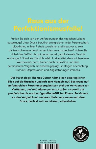 Psychologe Thomas Curran hat ein Buch mit dem Titel „Nie gut genug - Die fatalen Folgen des Perfektionismus und wie wir uns vom Selbstoptimierungsdruck befreien können“ im September 2023 bei Rowohlt vorgelegt. Er beschreibt Ursachen und Folgen, die ein