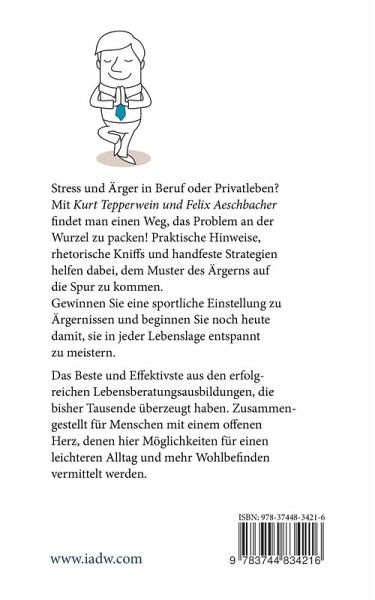 Stress und Ärger in Beruf oder Privatleben? Mit Kurt Tepperwein und Felix Aeschbacher findet man einen Weg, das Problem an der Wurzel zu packen! Praktische Hinweise, rhetorische Kniffs und handfeste Strategien helfen dabei, dem Muster des Ärgerns auf die Spur zu kommen. Gewinnen Sie eine sportliche Einstellung zu Ärgernissen und beginnen Sie noch heute damit, sie in jeder Lebenslage entspannt zu meistern. Das Beste und Effektivste aus den erfolgreichen Lebensberatungsausbildungen, die bisher Tausende überzeugt haben. Zusammengestellt für Menschen mit einem offenen Herz, denen hier Möglichkeiten für einen leichteren Alltag und mehr Wohlbefinden vermittelt werden.
