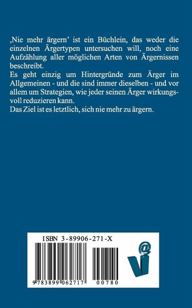 ,Nie mehr ärgern¿ ist ein Büchlein, das weder die einzelnen Ärgertypen untersuchen will, noch eine Aufzählung aller möglichen Arten von Ärgernissen beschreibt. Es geht einzig um Hintergründe zum Ärger im Allgemeinen - und die sind immer dieselben - und vor allem um Strategien, wie jeder seinen Ärger wirkungsvoll reduzieren kann. Das Ziel ist es letztlich, sich nie mehr zu ärgern.